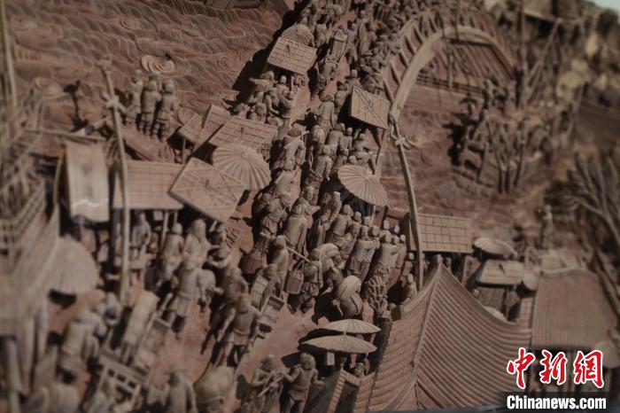 辜柳希的潮州木雕作品《清明上河图》(局部)。中新社记者 陈楚红摄