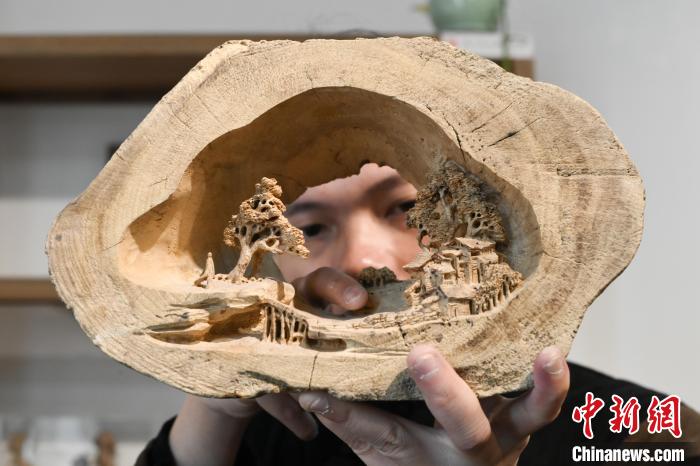 3月18日,广东省潮州市,郭少俊儿子郭奕辉展示他用一块朽木创作的潮州木雕《知足》。中新社记者 陈楚红 摄