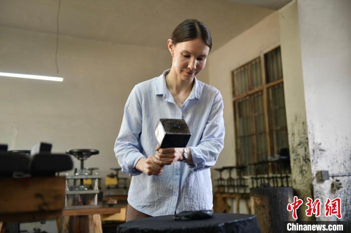 爱林正在体验锤墨技艺。中新社记者 储玮玮 摄