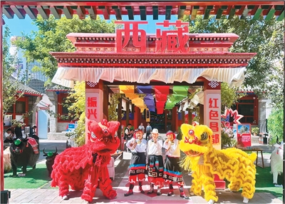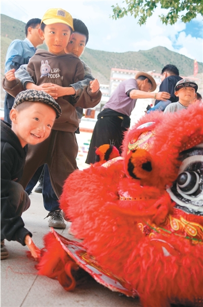 腾挪、闪扑、跳跃、翘首……鼓点铿锵有力,狮舞灵动生风。在西藏自治区昌都市洛隆县硕督镇团结广场,舞者们驾驭红狮表演狮舞,引得村民们鼓掌欢呼。每到喜庆丰收的日子,这样热闹的狮舞都会上演。