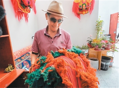 邓巴阿尼展示第一代舞狮服装。