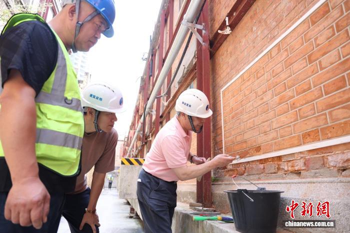 5月29日,“上海工匠”吴公保(右)在上海市静安区某工地修缮石库门清水墙。 中新社记者 汤彦俊 摄
