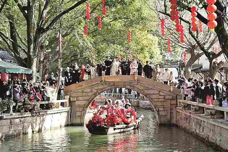 游客在江苏省苏州市同里古镇三桥景区观看水乡婚俗表演。赵晨暘摄/光明图片