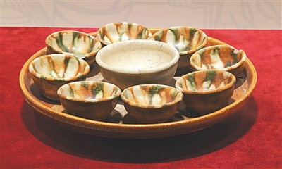 唐代饮茶蔚然成风,且注重礼仪、讲究茶器。三彩子母盘是唐代茶具的代表,反映了当时茶文化的兴盛。9个小盏置于茶盘之上,盘底平、边缘浅,盏可平稳放立,取饮方便,又不易存污垢,便于清洗擦拭,同时兼具美观。