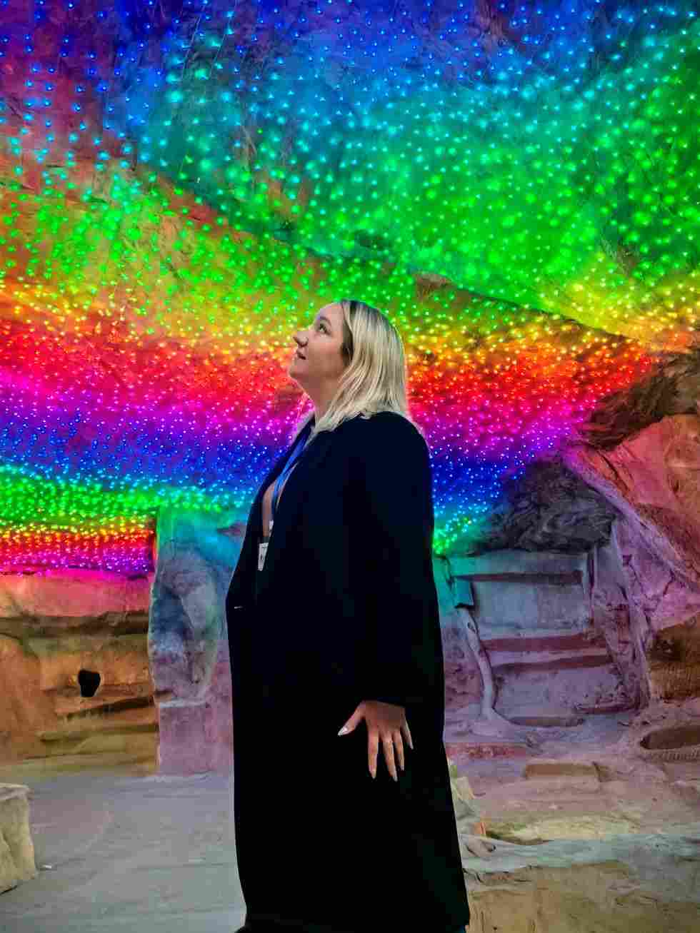 行程尾声,网红博主们来到花山世界花山谜窟主题园区,解锁智慧旅游新体验。在35号窟,大家跟随以黄山松鼠奇石为原型的虚拟人物“花仔”开启解谜之旅,循着声光电科技营造的悬疑氛围,探寻八大未解猜想,还与NPC演员互动,在动态体验中感受古徽州人文故事。2号窟则通过投影视频、激光灯、雾森等现代设施,打造出“迷雾竹林”“时光隧道”等奇幻场景,裸眼 3D 光影与石窟地貌交织,仿佛穿梭时空。博主们循着游览路线缓缓前行,时而驻足端详岩壁上的凿痕,时而惊叹于光影变幻下的洞窟秘境,纷纷举起相机记录这自然造化与科技赋能的双重魅力。俄罗斯网红博主惊叹:“千年石窟在科技加持下既藏历史厚重,又具现代酷感,真是一个宝藏游览地!”