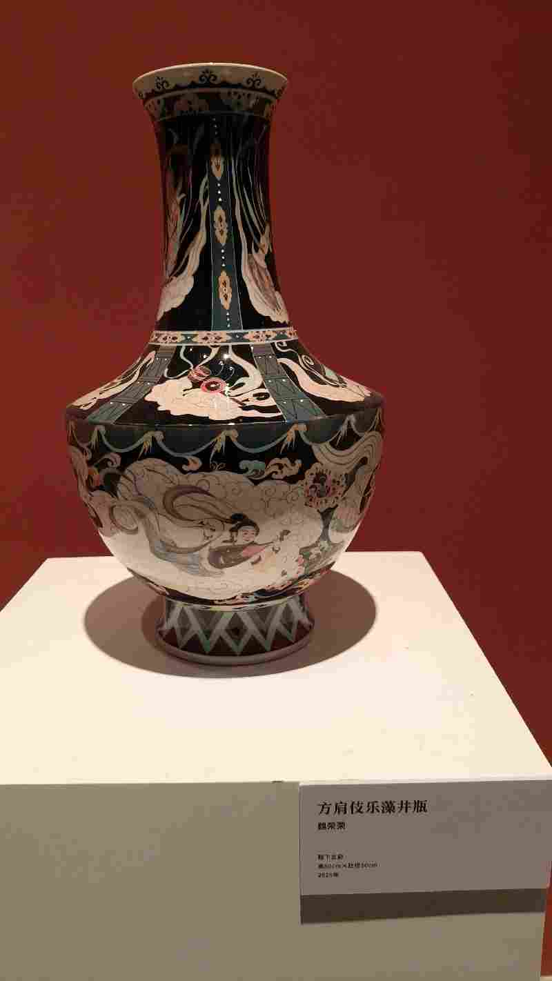 ▲魏荣荣 方肩伎乐藻井瓶 釉下五彩