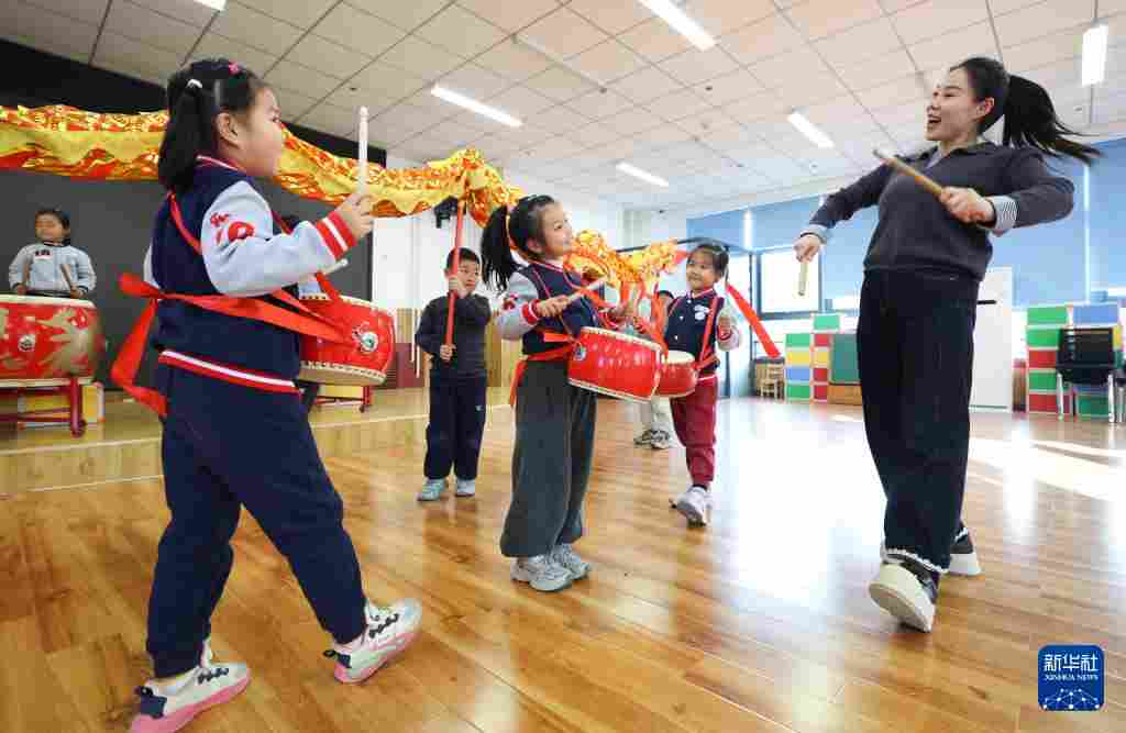 12月29日,河北省石家庄市新华区柏林幼儿园的小朋友在老师指导下练习腰鼓。