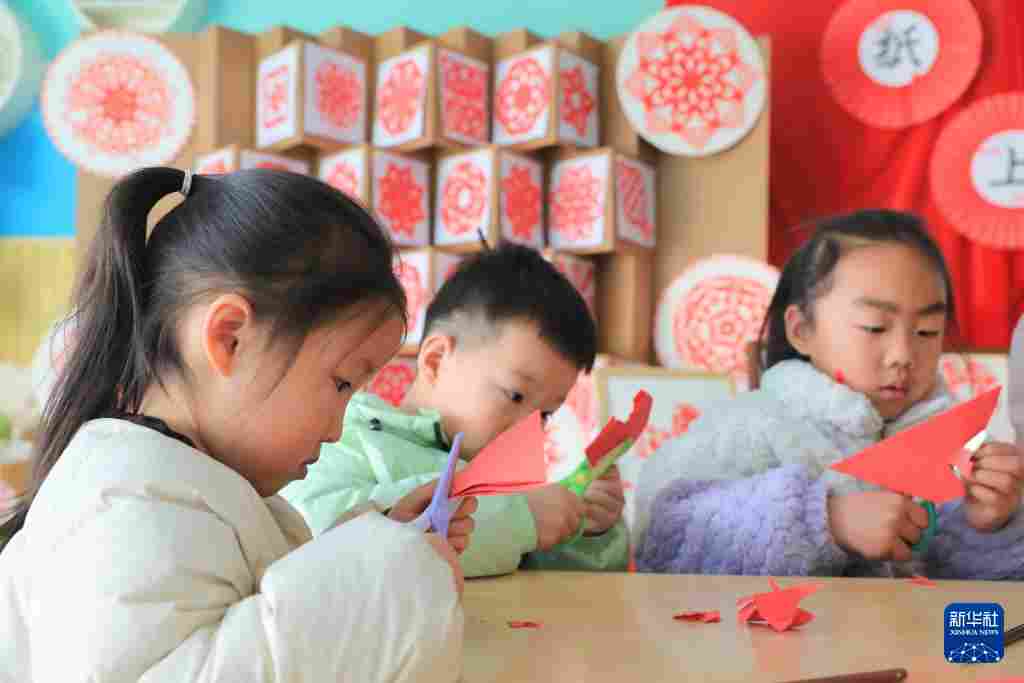 12月28日,在浙江省温州市鹿城区双屿街道垟田社区,小朋友在剪窗花。