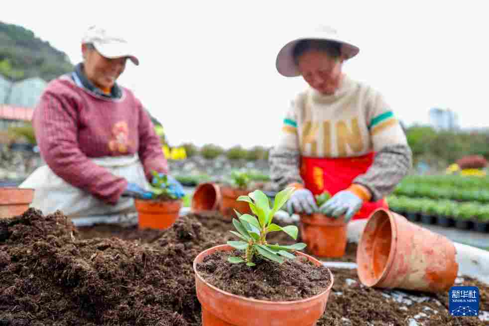 3月28日,工人在百里杜鹃管理区汇境花卉科技园管护杜鹃花苗。