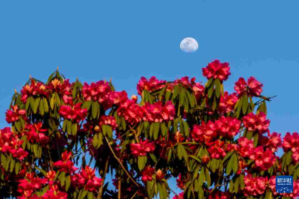 3月29日在百里杜鹃管理区普底景区拍摄的杜鹃花和月亮。