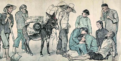在《流民图》诞生之前的岁月里,这个青年人的内心便隐忍和积蓄着彻骨之“苦”,他不断用画笔刻写多灾多难的祖国和人民:《朱门酒肉臭》《卖子图》《与阿Q像》《流浪的小子》《小子卖苦茶》《轰炸之后》……蒋兆和以“一支秃笔”竭诚从现实中烹制的“一碗苦茶”引起了有心人的共鸣:齐白石题词说“卖儿三尺画,压倒借山人”;美国人司徒雷登发现“特殊意义乃在于其社会目的”,“他不为达官贵人写像,而选择微贱和不幸者作为典型。从而深刻地揭示出他们的悲哀和可贵的坚毅”。