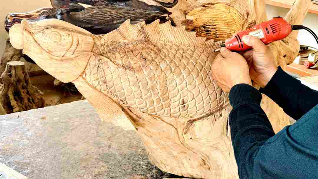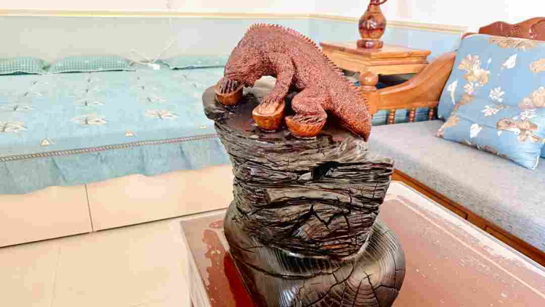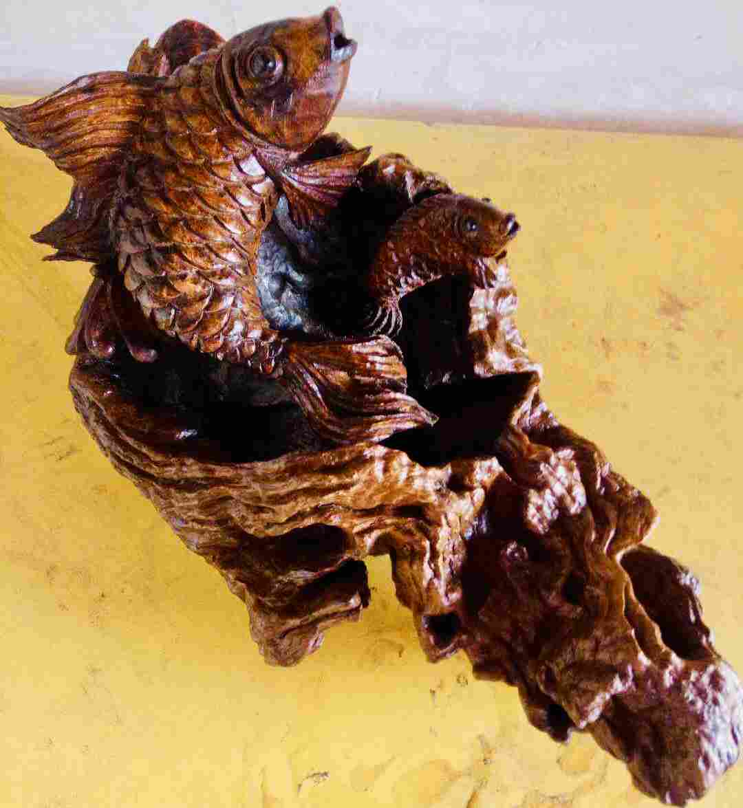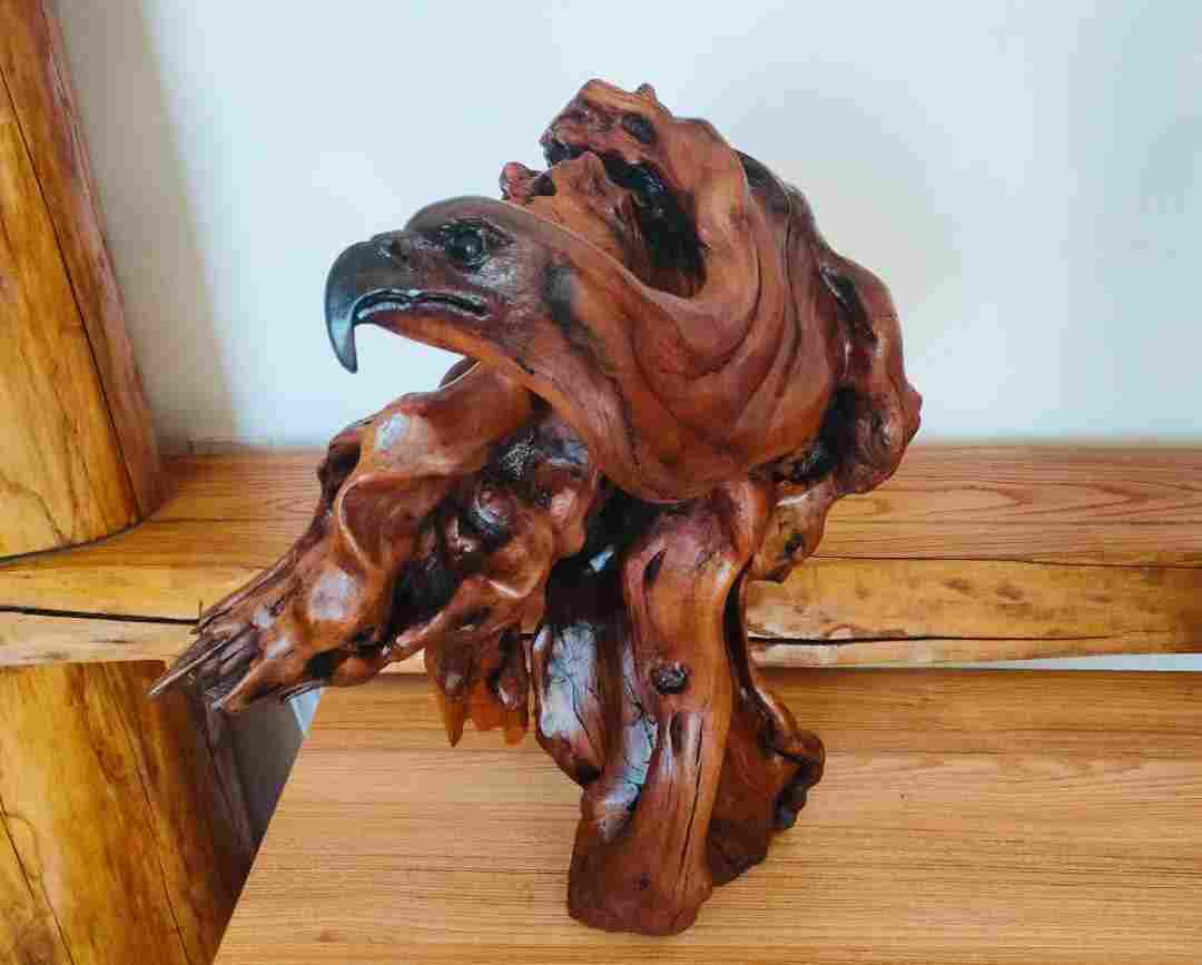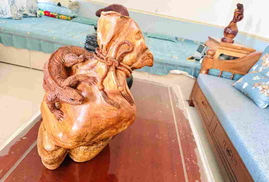 他的创作材料,全部来自大自然的废弃枯根,包括黑格兰树根、杨树根、榆树根、紫檀树根等,只要形态合适,他都会细心收集。“这些树根要是没人管,最后就烂在地里了,太可惜。” 他轻轻抚摸着一块待加工的树根,语气里满是爱惜。创作时,他从不会随意砍伐树木,总是最大程度保留树根的天然形态,再顺着纹理、轮廓构思作品,让每一件木雕都带着自然的“印记”。