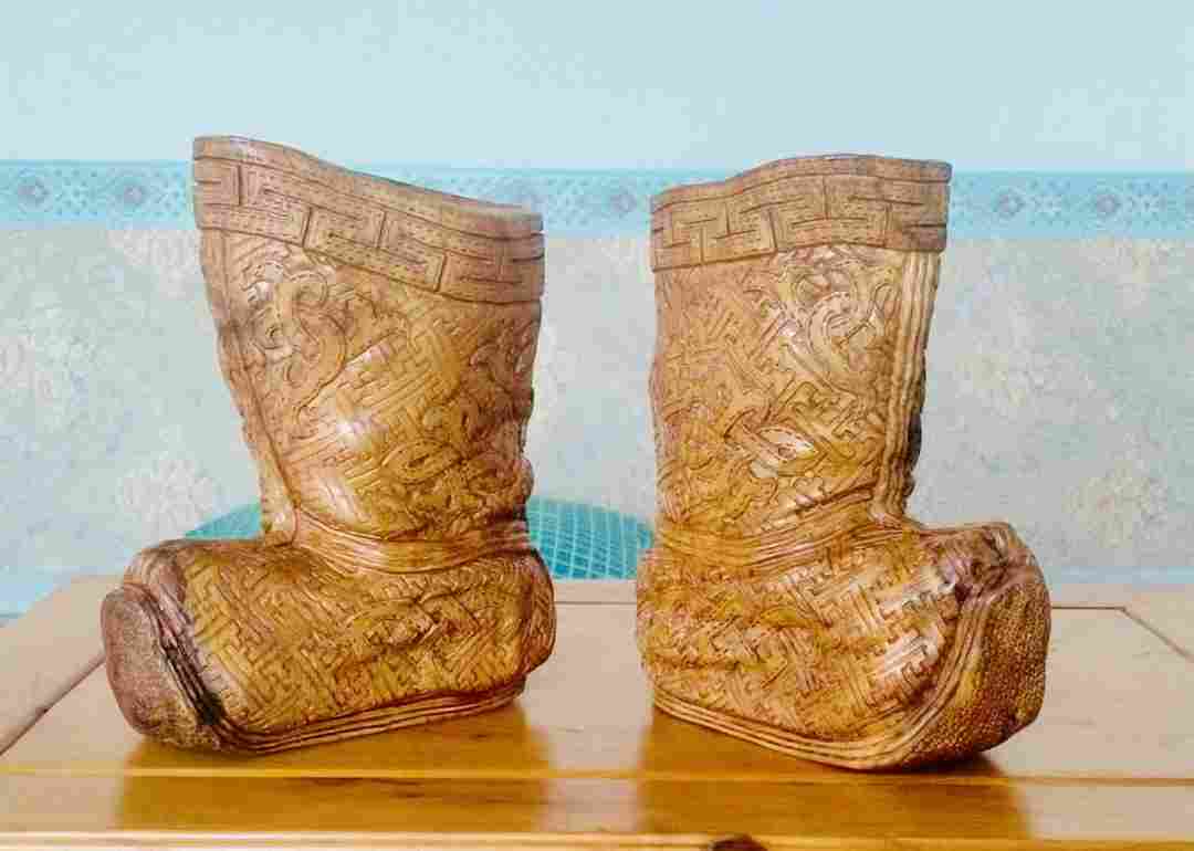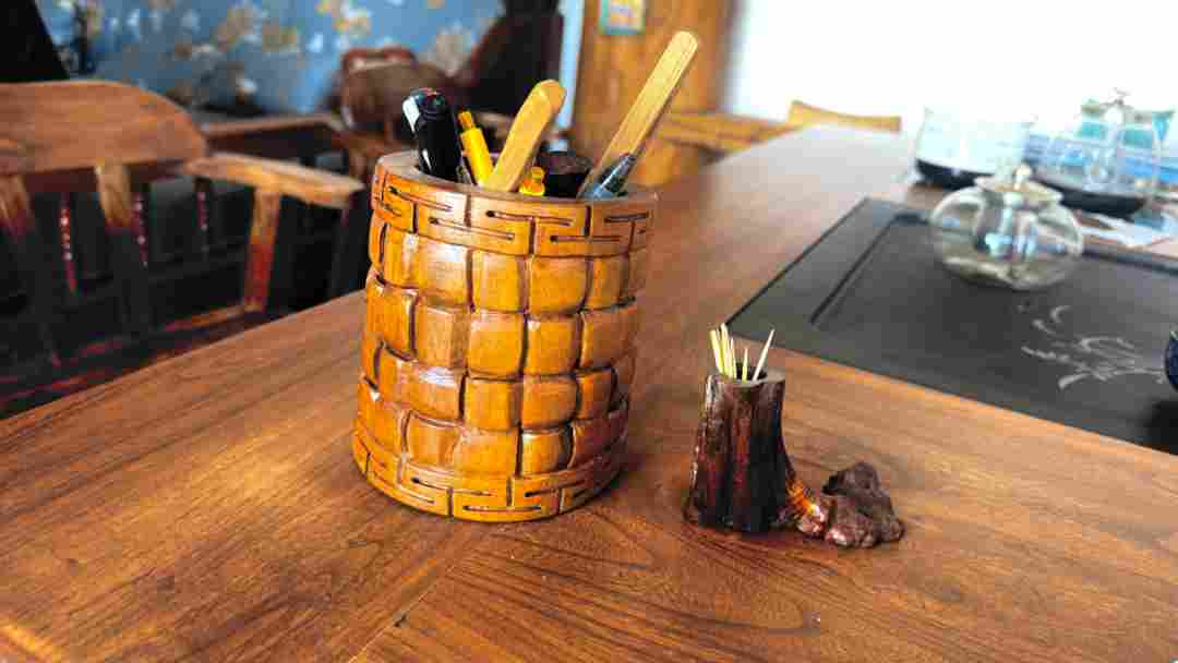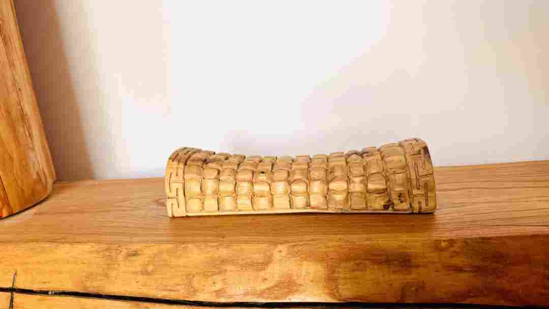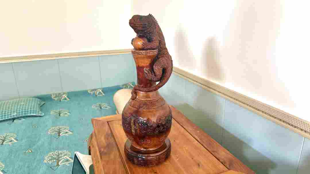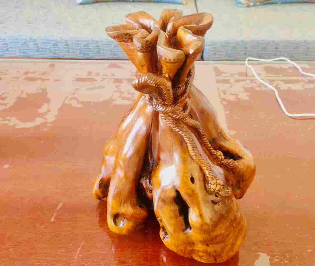 20多年的坚守,让宝音特古斯收获了诸多荣誉,其中最具分量的是八省区首届“天骄杯”民族手工艺品大赛木雕类一等奖。走进他的家,就像走进一个小型根雕博物馆:有用树根巧妙制成的鄂尔多斯褡裢、精致的笔筒、小巧的牙签筒、古朴的木雕枕头,以及形态各异的蜥蜴木雕……每一件都是他用匠心赋予枯根新生的见证。